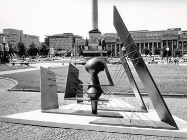 Auf weißen Podesten erhebt sich ein Bühnenraum aus schräg emporsteigenden Bronze-Flächen, die mit schwarzen Hanfseilen verspannt sind, jeweils drei in Parallelformation. Inmitten der sich überlagernden, überschneidenden, sich rhythmisierend aufschaukelnden Linien und Flächen steht eine geometrische Gestalt, die ebenso wie das Raumgefüge an Schlemmers Figurinen in der Stuttgarter Staatsgalerie denken lässt. Beim Umschreiten dieser plastischen Inszenierung verändern sich die Winkel der Flächen und Linien, so dass das ganze Gebilde wie in Bewegung zu geraten scheint und einen mechanistischen Tanz suggeriert.