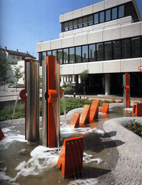 Ihre erste Skulpturenlandschaft mit Wasser schuf Gerlinde Beck für den Innenhof der Stadt- und Kreissparkasse Pforzheim. Neben Kern-Mantel-Stelen, aus denen das Rotinnere diesmal heraus drückt und Wasser speit, gruppieren sich spitzwinklige Elemente, die an Haifischflossen erinnern und aus deren Düsen ebenfalls Wasser spritzt. Die Kugeldüsen lassen sich punktgenau einstellen, so dass die Wasserstrahlen als grafische Raumlinien erscheinen können und die Wellenbewegung sich auf das schäumende Wasser im unregelmäßig rund gefassten Steinbecken beschränkt. |