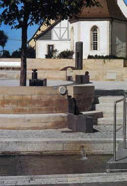 Gleich mehrere Brunnen mit Steinsäule, Gewicht und Lot platzierte Gerlinde Beck auf dem abfallenden Marktplatz von Altbach bei Esslingen, bei dem eine Bodenzeichnung im Sinne eines Nebenflüsschens die „Bächle“, die wasserführenden Bodenrinnen ergänzt. Eingefügte Steinsitzinseln sollen zur Kommunikation in diesem zentralen öffentlichen Raum auffordern.