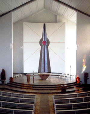 Schon Mitte der 1970er Jahre hatte Gerlinde Beck den Altarraum mit Tabernakel und Ambo sowie das Portal einer Kirche in Kuchen / Fils gestaltet, aber erst in Fellbach-Schmiden konnte sie eine gesamte Kirchenraumgestaltung realisieren. Für die Katholische Kirchengemeinde Zur Allerheiligsten Dreifaltigkeit entwarf sie das Relief der Rückwand aus Chromnickelstahl, Holz und Farbe, die Bodenzeichnung, Altar, Ambo, Taufbecken, Stipes und Konsole. |