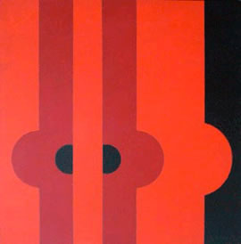 Außerdem hat die Erkenntnis, dass Farbe optisch das Volumen des Raumkörpers verändert, die Künstlerin immer wieder gereizt. In der Fläche experimentiert sie – es ist die Zeit der Op-Art – mit Schattierungen von Rottönen, aber auch Blau oder Gelb findet sich, oft kombiniert mit schwarz. Strenge geometrische Formen analog ihren Skulpturen jener Jahre wirken außerordentlich plakativ.