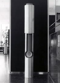 Aber nicht nur das, bei den aufgeschnittenen Röhrenformen treten die Vorder-, Rück- und Seitenformen markant hervor, das Innere wird durch rote Farbe akzentuiert und bildet einen starken Kontrast zur stählernen Ummantelung. Mit zweieinhalb Metern Höhe wäre diese Stele ein weithin sichtbares Zeichen im öffentlichen Raum – ähnliche hat Gerlinde Beck auch geschaffen.