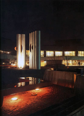 Als Antwort auf den architektonischen Kubus des Saalbaus entwarf Gerlinde Beck die mehrteiligen, röhrenförmigen Stelen, deren roter Kern von glänzendem Edelstahl ummantelt wird. Dazu hat sie aus dem bildnerischen Thema der Kern-Mantel-Skulptur die „Bandauslagerungen“ entwickelt, und diese roten Fühler werden in der Ruhezone als Sitzbänke benutzt und dienen im Durchgangsbereich als Abgrenzung gegen die Fahrbahn. So entstand eine Platzgestaltung, die dem Publikum wirklich als Kommunikationsort dient, bei Tag oder in Becks beeindruckender nächtlicher Beleuchtung. |