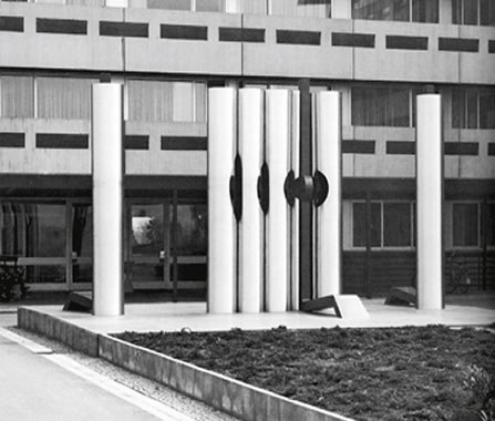 Eine begehbare Skulptur, ein Tor mit zwei Durchgängen vor dem Eingang, hat Gerlinde Beck für das Kreiskrankenhaus Mühlacker geschaffen. Sieben Edelstahlröhren mit rotem Innenleben und Auslegern behaupten sich gegen eine starre Architektur und vor einer eher langweiligen Fassade; diese, ihre erste Mengenplastik erinnert trotz der formalen Strenge an eine Figurengruppe, die sich einander zu- oder voneinander abwendet.